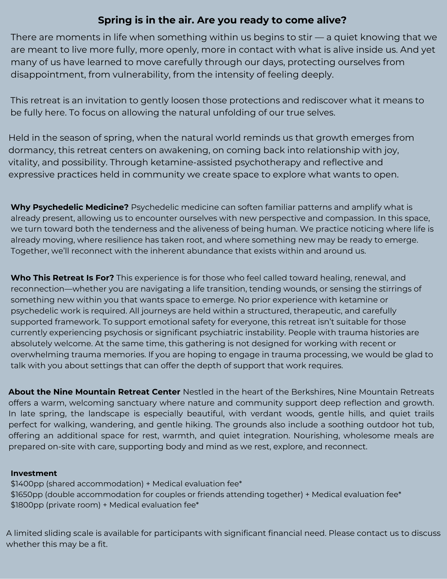 Thoughtfully guided retreats integrating medicine, psychotherapy, mindfulness, and embodied practice—supporting reflection, connection, and meaningful growth.
